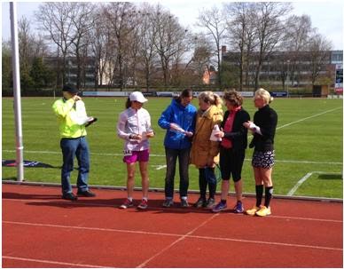 | Faster half of womens' 10,000 field. Rikke 4th from right. Simone furthest right. Photo courtesy of DAF. |